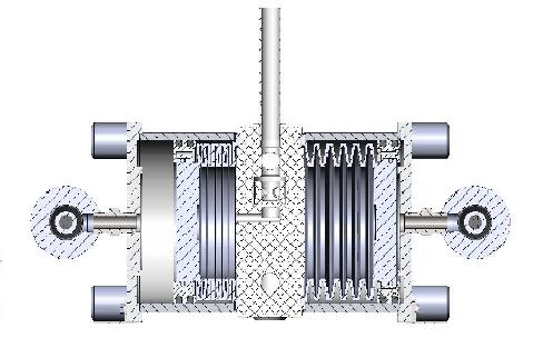 新型风囊气缸泵的设计为单侧风囊室(风囊与泵体外壳之间)用PTFE材料档板分为两室,向两室内按时间分别注入压缩空气,由于气阀的自动开闭,两室的气压变化带动量风囊的压缩与膨胀,从而达到家吸吐液体的效果。